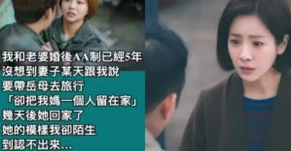 我和老婆婚後AA制已經5年,沒想到妻子某天跟我說,要帶岳母去旅行「卻把我媽一個人留在家」,幾天後她回家了,她的模樣我卻陌生到認不出來了!!