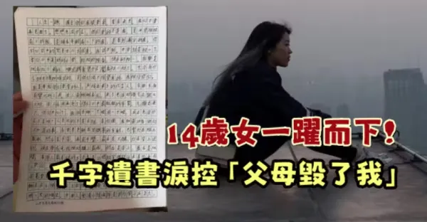 14歲女一躍而下 千字遺書淚控「父母毀了我」請收手這種傷害 願弟弟被好好對待「盼來生別再相見」