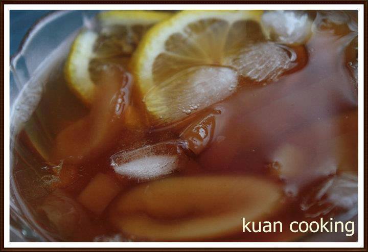 2.倒入檸檬汁,接著再放入檸檬片,煮一會,熄火盛入碗中,即可享用。。也可以待涼後放入冰箱冷卻後享用