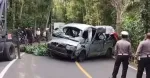 轎車猛撞樹後翻覆,車身毀壞不堪。