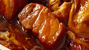 東坡肉是蘇東坡在黃州(今湖北黃岡)貶官期間創製的一道菜肴。當時,黃州豬肉價格低廉,蘇東坡便購買了一些豬肉,回家後將其切成方塊,用慢火燉煮至肉質酥爛,再以姜、蔥、酒、醬油等調料烹制而成。這道菜肴色澤紅亮,肉質酥爛,味道鮮美,肥而不膩,深受人們喜愛。