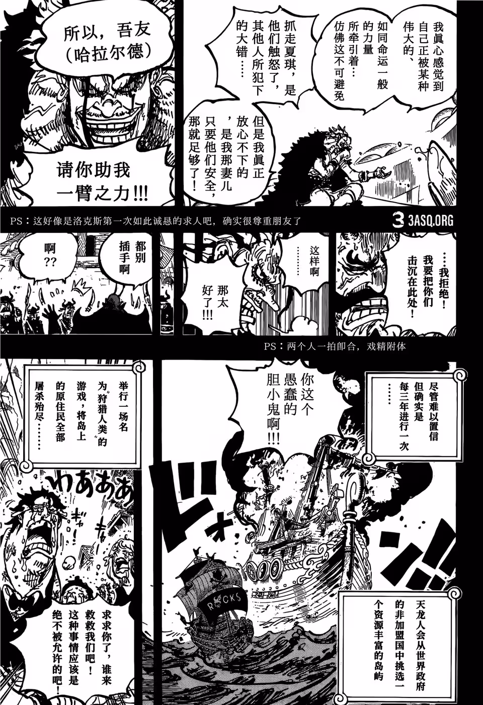 夏琪被綁架了一年時間,洛克斯海賊團才知道夏琪還活著,她就在神之谷。夏琪成為天龍人的獎品,狩獵大賽居然是真實存在的,白鬍子還以為這是傳言,大媽也想去神之谷弄一些惡魔果實給自己的孩子,凱多也想得到一個強大的惡魔果實。