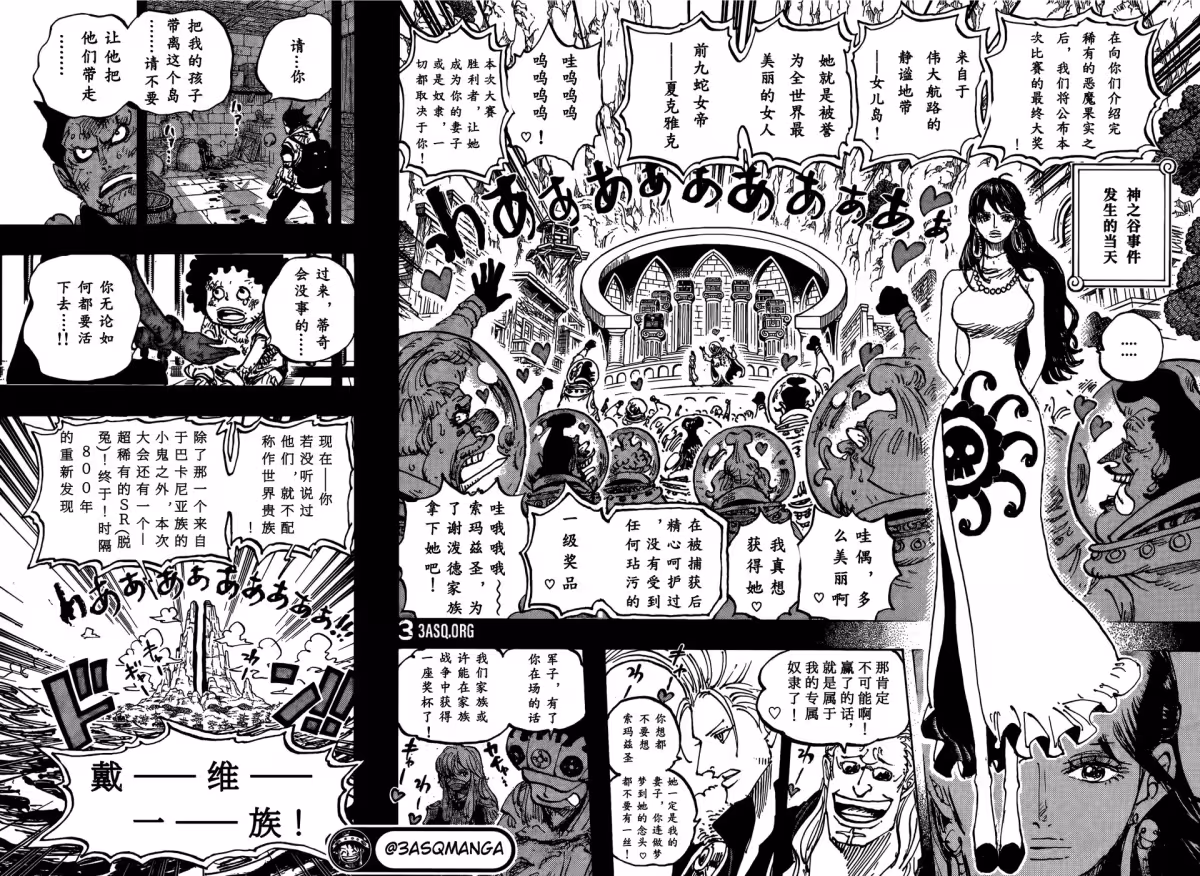 在神之谷當中,天龍人已經準備好了,他們拿出了這次大賽的獎品,九個惡魔果實,還有夏琪這個大美女。她是九蛇海賊團的女帝,被捕了一年時間還沒有被玷污,誰能拿下冠軍,誰就可以得到夏琪,索瑪茲聖也想拿下夏琪,讓他成為自己的奴隸。但加林聖說他要讓夏琪成為自己的老婆,軍子也出現了,龍找到了重傷的紅髮的母親。