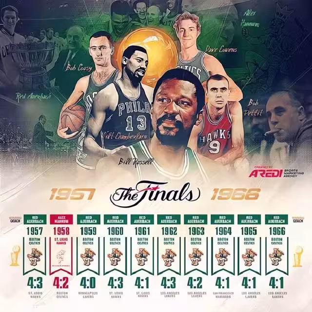 這裡面季後賽前幾輪就不納入討論了,名人堂和總冠軍數量息息相關,而那個年代大多數冠軍都被塞爾蒂克斬獲,最終導致的結果就是拉塞爾身邊共有12位隊友入選了奈史密斯名人堂,而總決賽對手裡進入名人堂的球星一共才6位,他們分別是佩蒂特、哈根、貝勒、韋斯特、張伯倫以及蓋伊羅傑斯。