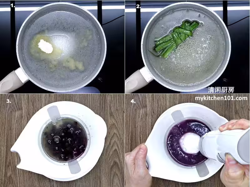 1 *紫薯湯:把450克清水滾開,加入150克紫薯丁和2葉香蘭葉。再次加熱至滾開,以中小火煮15分鐘。取出280克紫薯湯。