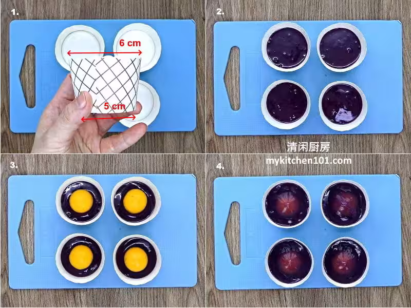3 把少許燕菜月餅餡倒入4個muffin紙杯 (杯口直徑=6 cm,杯底直徑=5 cm,高=4.8 cm)。加入燕菜月餅」蛋黃」。再加入燕菜月餅餡直到總重量等於60克。