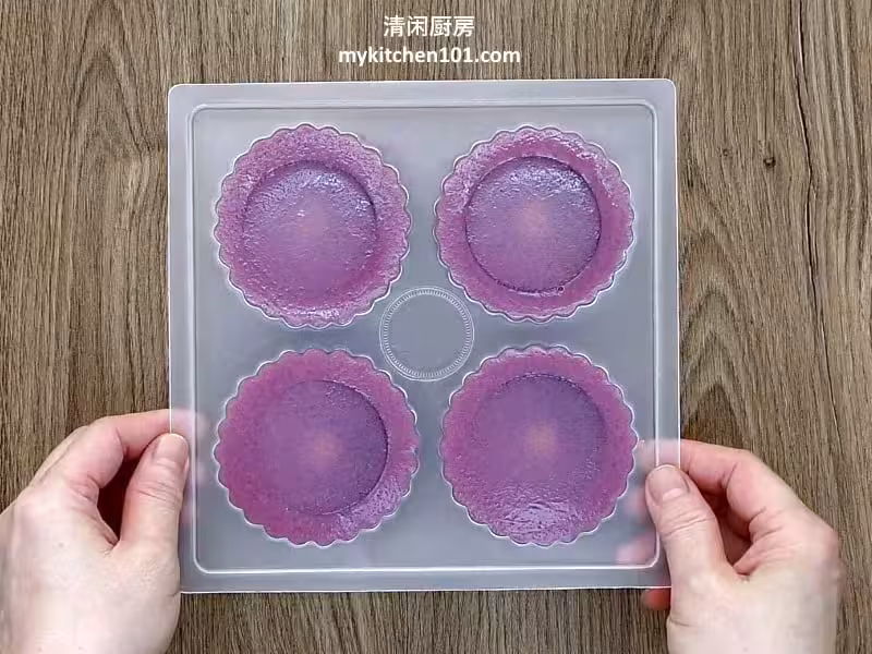 1 把少許紫色燕菜月餅皮倒入燕菜月餅模里,加入紫薯燕菜月餅餡,再倒入紫色燕菜月餅皮直到滿。