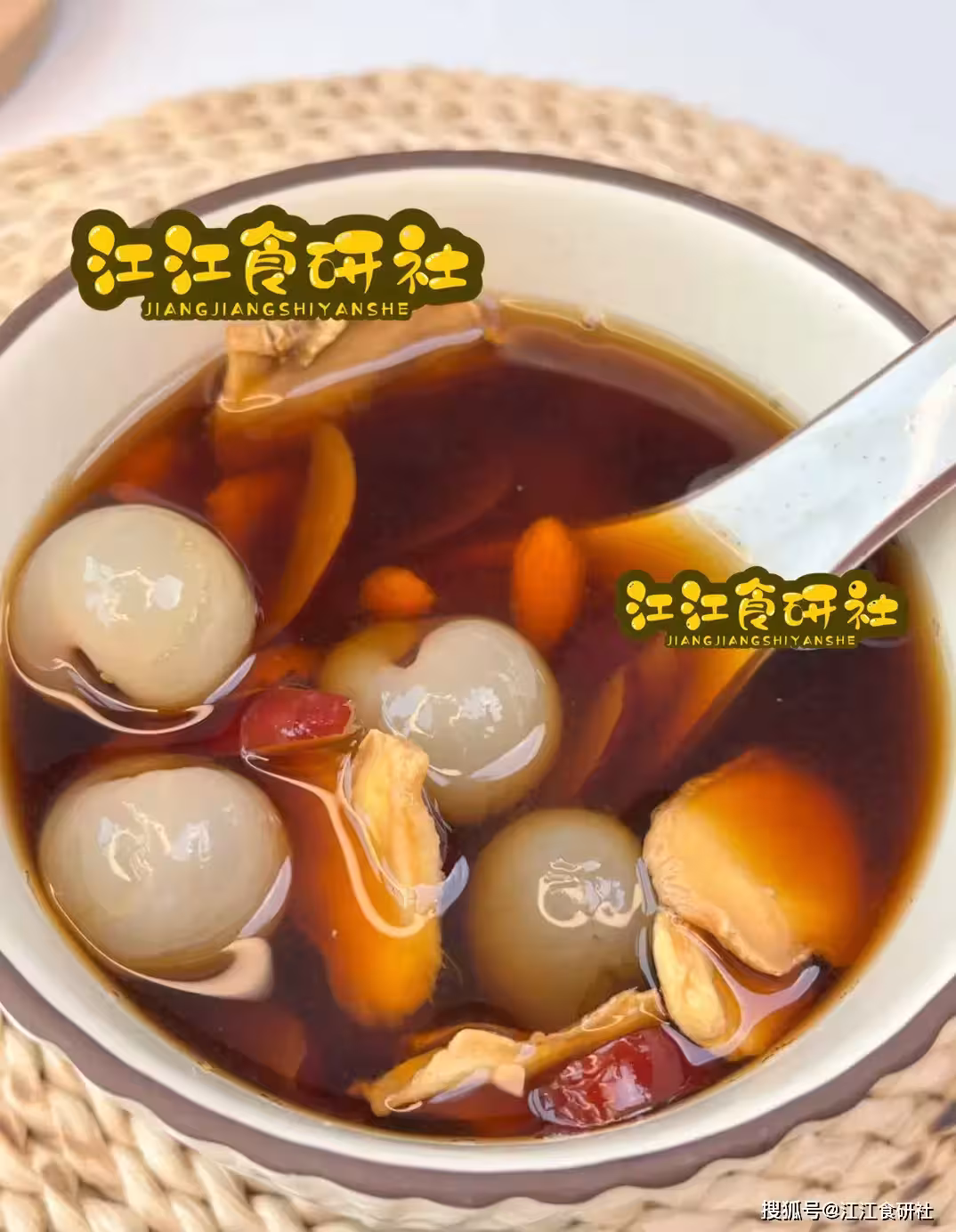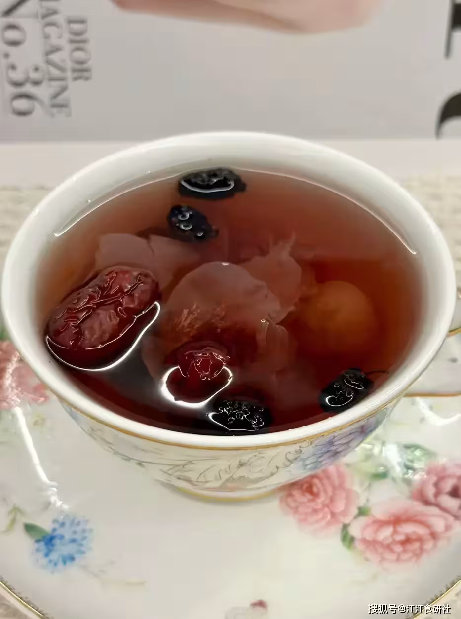 現在我煮得可溜了:5 顆帶殼桂圓(挑的時候捏著有彈性、聞著有甜香的才好)敲裂,加 3 顆桑葚干、1 塊泡軟的茯苓,冷水下鍋小火煮 20 分鐘,煮到湯能掛在勺子上就差不多了,最後撒把玫瑰燜 3 分鐘。