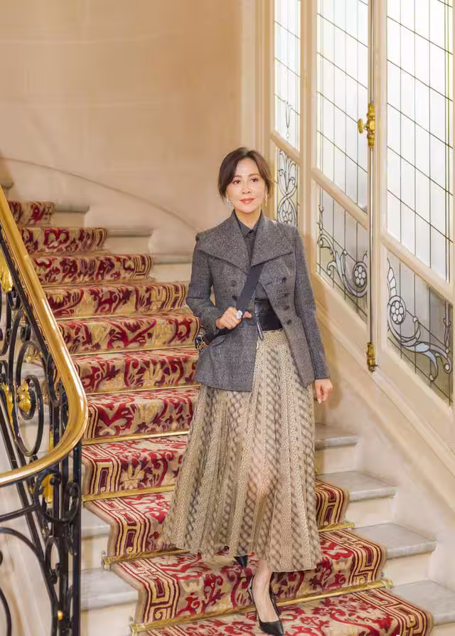 灰色西裝對女性膚色十分友好,門襟是雙排扣設計,帶著英倫風情,再加上大翻領、敞開穿,無形間彰顯幹練氣質。墊肩的存在完美勾勒肩部線條,視覺上呈現直角肩。襯衫選擇了黑色款,衣擺並沒有露出來。襯衣的顏色與西裝剛好一深一淺,襯得人更沉穩了。腿上是一件半身裙,裙子是米咖色,而且面料微透,可隱約看見腿部肌膚。飄逸的裙擺營造浪漫氛圍,格紋圖案的加入讓裙子看著更精緻。