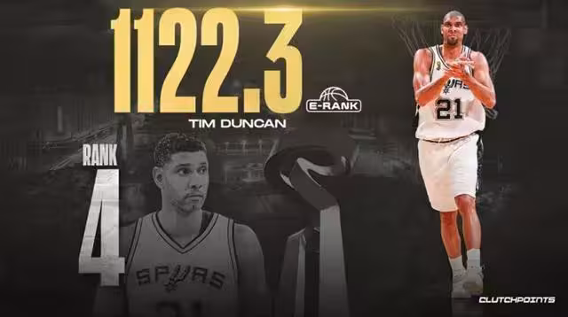 鄧肯第四,打球穩得像塊石頭,十九年把馬刺扛在肩上,常規賽五十勝是家常便飯,五個冠軍,三個FMVP,兩個MVP,一個人守著一座城,季後賽贏過科比也贏過詹姆斯,模型就喜歡這種又長久又厲害的,直接把他送到了前面。
