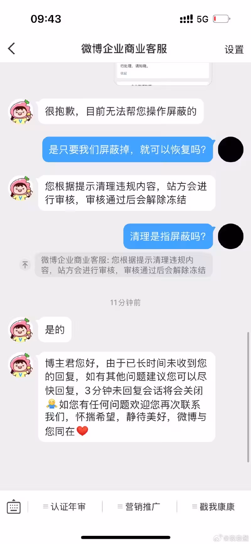 管理員展示了自己和微博方的對話,表示因為發帖量太大,手動刪除實在沒辦法,希望官方可以用系統幫忙,結果遭拒。