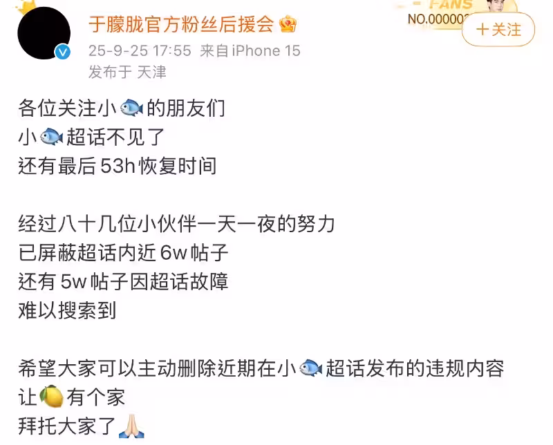 由於發帖量真的太大,管理員在25號晚間,用後援會官方號發文,懇求這段時間內,曾在超話發帖的網友可以自行刪帖👇