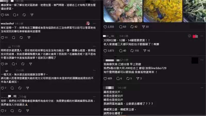 「應該找熟悉地形的人帶路,才知道怎麼把便當送進去」。同時也有人憤怒直言,「花蓮縣政府是直接擺爛嗎?物資很多卻分不到最需要的人手裡」、「老人沒得吃,卻看到廚餘桶里滿滿雞翅,真的心痛」。