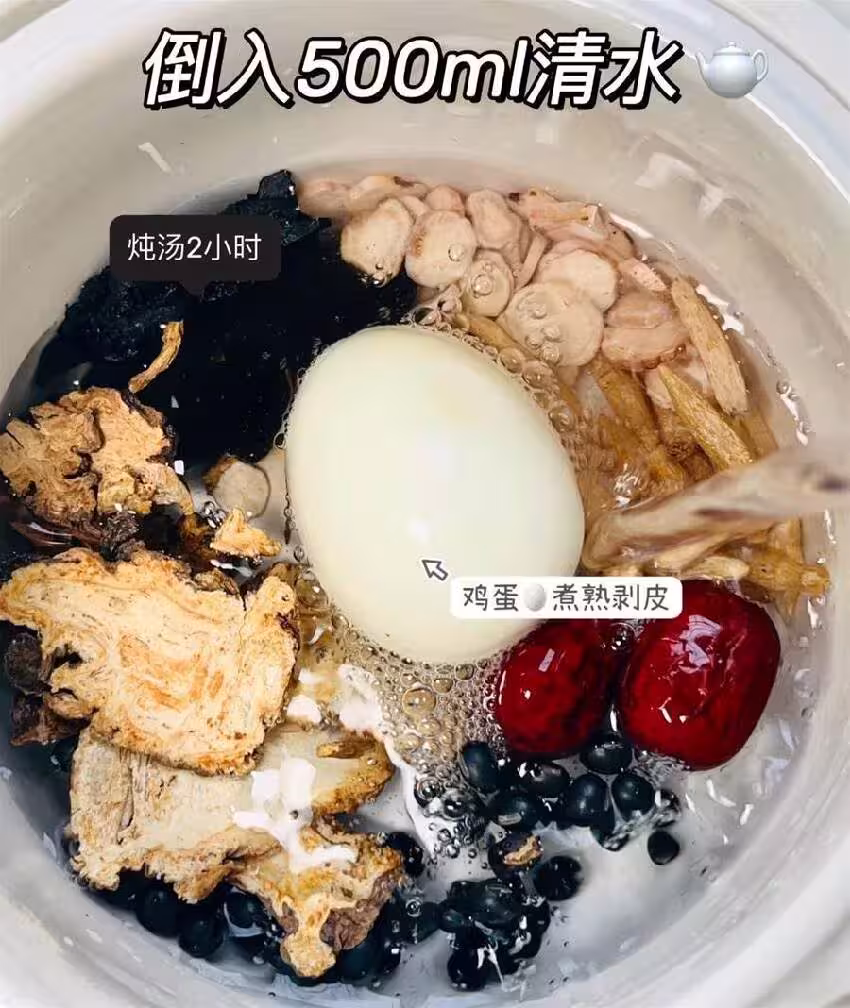 熟地黃 12g、白芍 9g、麥冬 8g、川芎 6g、當歸 9g、紅棗 2個、黑豆 1把、熟雞蛋 1個、清水 500ml