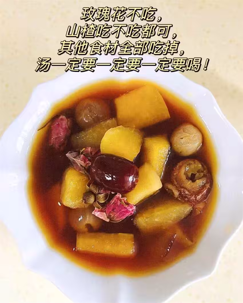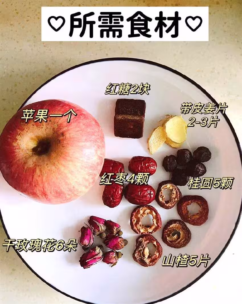 蘋果 1個、紅糖 2塊、帶皮薑片 2 - 3片、紅棗 4顆、桂圓 5顆、山楂 5片、干玫瑰花 6朵