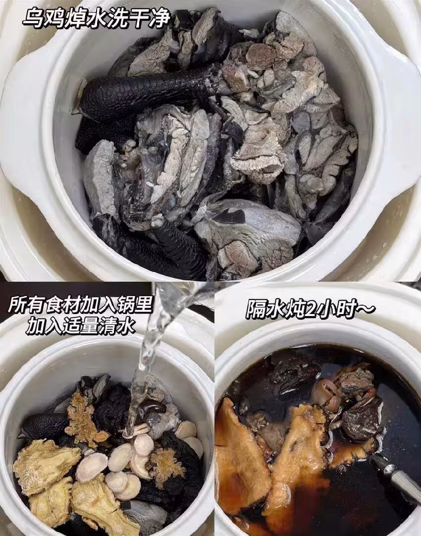 烏雞 半隻、當歸 9克、熟地黃 12克、川芎 6克、白芍 9克、清水 適量