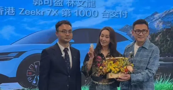 郭可盈在香港買37萬國產電車,與丈夫現身提車,林文龍打扮好時尚