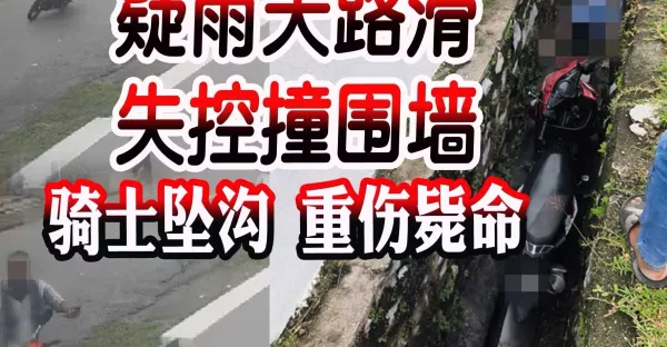 疑雨天路滑 失控撞圍牆 騎士墜溝 重傷斃命